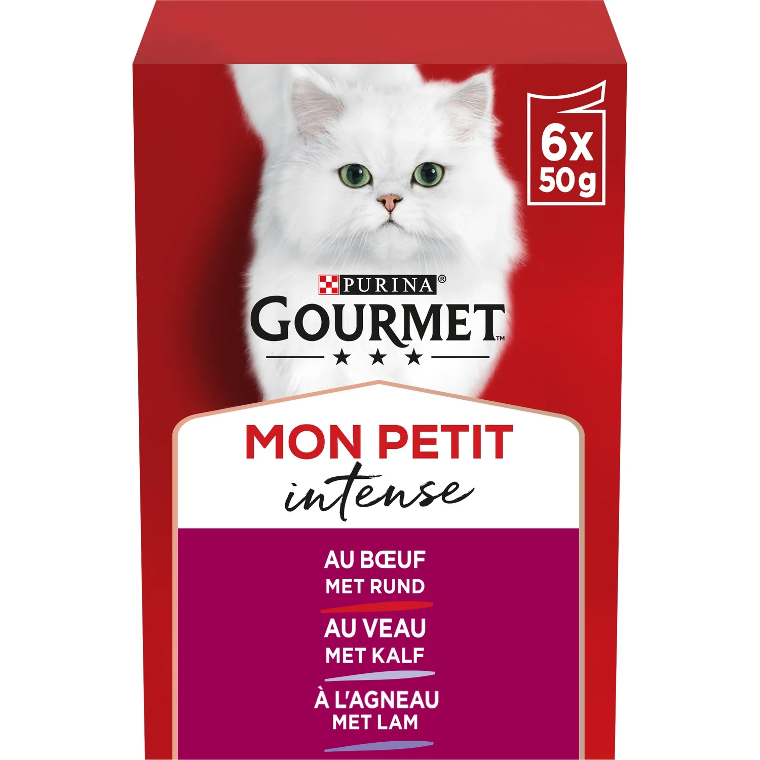 Pour les fins connaisseurs, tout est une question d’intensité des saveurs. GOURMET MON PETIT Intense. Une collection raffinée de délicieuses recettes qui célèbrent l’essence même du goût. Nous avons sélectionné des ingrédients de haute qualité et lentement cuit de délicats émincés dans une délicieuse sauce afin d’en extraire toute l’intensité de leurs saveurs. Votre chat fin connaisseur adorera nos petites portions fraîchement servies à chaque repas, pour une expérience gustative unique. Facile à ouvrir, facile à servir, sans gaspillage et dans un sachet conçu pour être recyclable. Toutes nos délicieuses recettes sont 100% complètes et équilibrées pour des chats adultes.