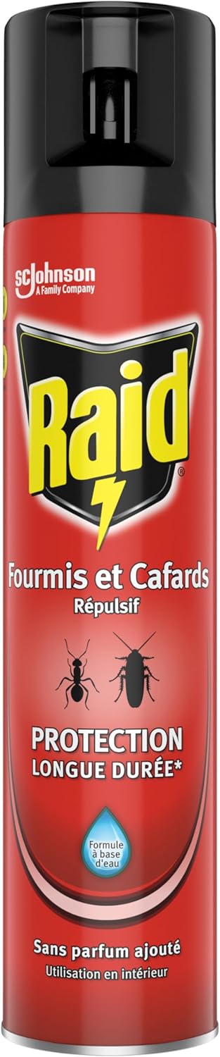 - CTION LONGUE DURÉE : l’aérosol répulsif Raid Fourmis & Cafards offre jusqu’à 24 heures de protection contre les fourmis et les cafards